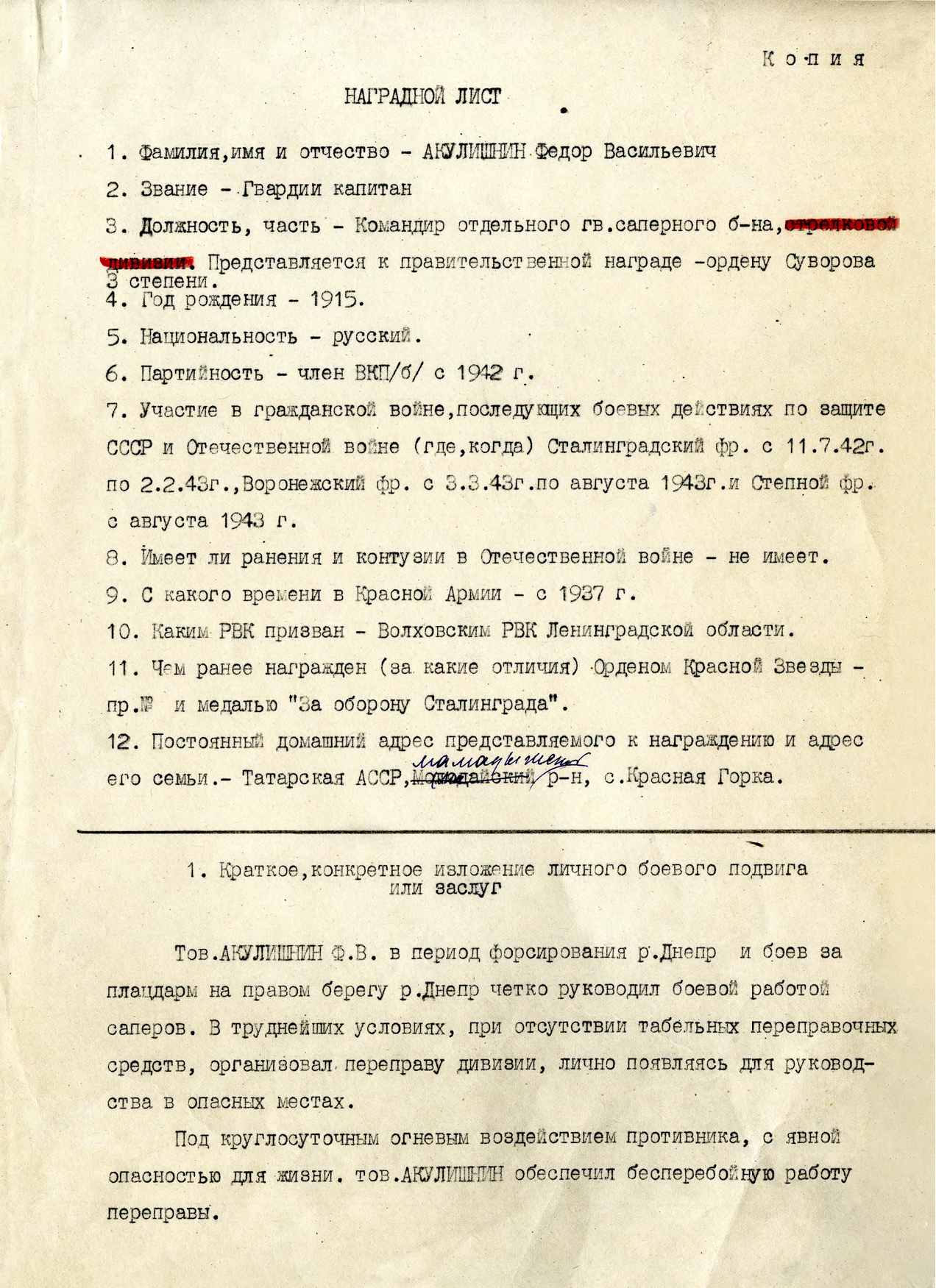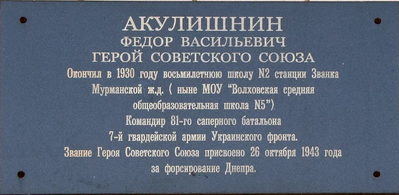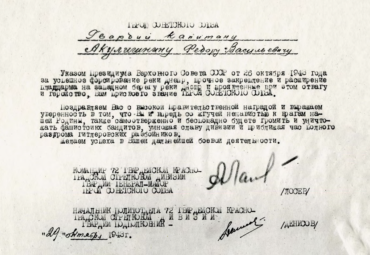Указом Президиума Верховного Совета СССР от 26 октября 1943 года за успешное форсирование реки Днепр, прочное закрепление и расширение плацдарма на западном берегу реки Днепр и проявленные при этом отвагу и геройство гвардии капитану Акулишнину Федору Васильевичу присвоено звание Героя Советского Союза с вручением ордена Ленина и медали «Золотая Звезда».